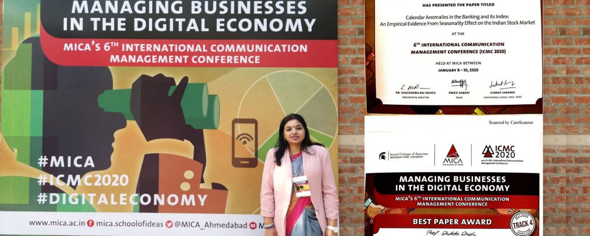 KSOM congratulates Prof. Shikta Singh for getting the best paper award in the 6th International Communication Management at MICA. The paper titled ” Calendar Anomalies in Banking and IT Index: An Empirical Evidence from Seasonality Effect on the Indian Stock Market” was co-authored with Prof. Chandrabhanu Das.